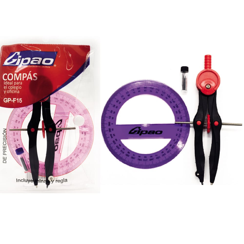 REFERENCIA: GP-F15 PRESENTACIÓN: Empaque individual en estuche de vinilo TAMAÑO: 11 x 16.5 cms EMPAQUE: Display x 24 Paca x 288 uds. COLORES: Surtidos CARACTERÍSTICAS •Plástico •Con perilla de precisión •Con puntas de grafito •Con Transportador
